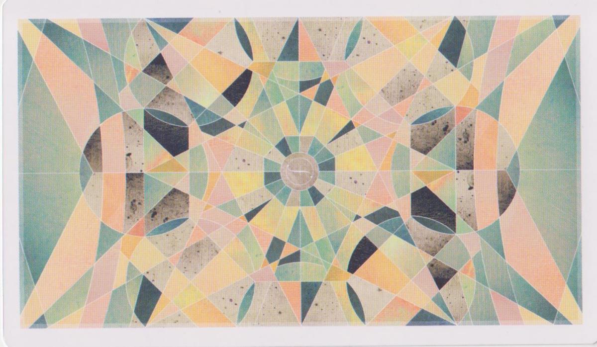 As for the cards, “well done” seems staid and lifeless as a description. The deck’s edges are gilt in silver; the card stock is lush and sensual to the touch. I will say that new, the cards can feel a bit stiff and my hands were quite sparkly after the first few reads, but after that, the cards shuffle beautifully and the silver stays on the card edges rather than my hands. The backs reflect the tension within the deck, a mass of organized angles softened by the colors used, and they are reversible. I must admit that I have rarely connected so quickly and pleasantly to a deck, and my readings were meaningful practically out of the box.