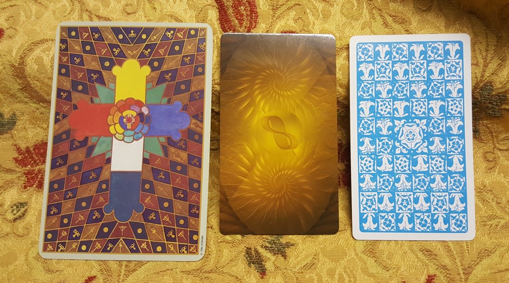 Additionally, the pips are generally well constructed and very faithful to their source material. As a fan of the Crowley-Harris Thoth for literally decades, I appreciate a respect for the original symbolism. I daresay that most of the pips work well as images alone and as recreations of Harris’s original designs. In a comparison that I should probably leave to another review entirely, the pips are the sole reason that I will not use Lo Scarabeo’s Liber T: Tarot of Stars Eternal. As for the backs of the MTT cards, they are reversible, and their composition is a Möbius strip surrounded by uninspired abstractions in various shades of yellow.