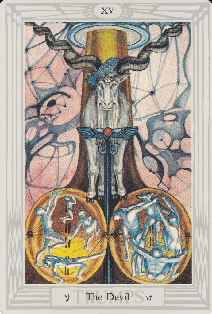 On Arcanum XV, the three-eyed goat of Harris’s original Devil is replaced by a man in MTT. Call me crazy, but there is something much more…sexual…about the symbolism of the goat (already loaded with centuries’ worth of cultural accretion) perched atop the more obviously phallic Harris image (no Mississippi sex-goat jokes). The gym rat of the MTT seems positively uncomfortable trying to lounge seductively on those two rock-hard, crystalline testes with that marble-hard shaft pushing on his back. In this case, the smooth, clear, computerized image just doesn’t work. Speaking of gym rats, the MTT Fool, Magician, Devil, and all the Princes just body-shame the hell out of me. I don’t appreciate it, but that’s just my mid-life crisis talking.