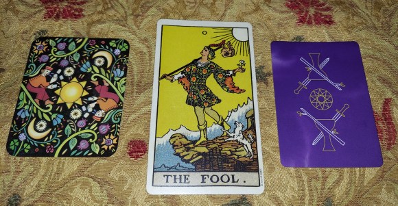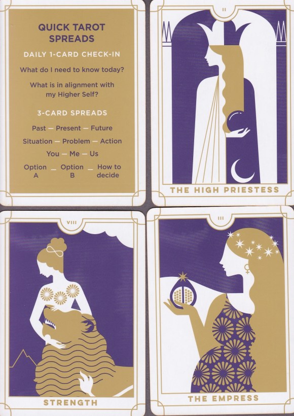 The cards, however, are a bit better if a clear, clean aesthetic appeals to you. As I mentioned earlier, there are two extra cards included with the deck: “Seven Steps to an Accurate and Insightful Tarot Reading” and “Quick Tarot Spreads” with four three-card spreads, all labeled with such no-nonsense appellations as “Present-Past-Future,” “Situation-Problem-Action,” and “You-Me-Us.”