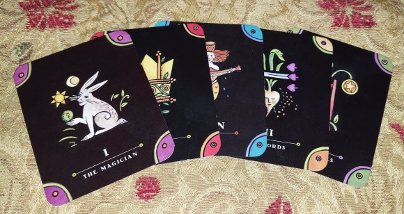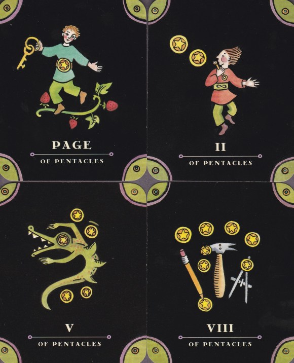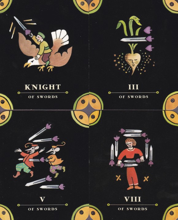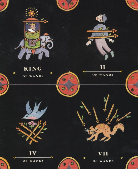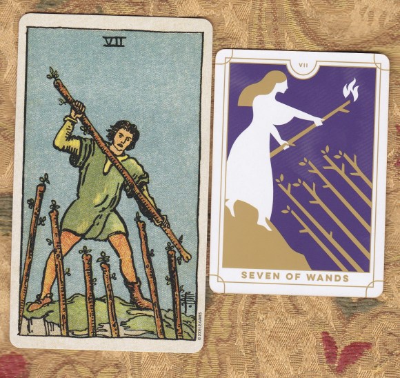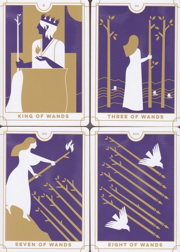 I hate to compare one deck with another. I want to leave each artist’s statement as it is; however, since this deck is based on the RWS cards, knowledge of that deck would be a boon to reflection on this one. Without that knowledge, that imagistic language, a card like the Seven of Swords becomes even more mysterious than it already is. The Seven of Wands can also be vague without some context. Perhaps that enigmatic quality is to be lauded as it certainly opens the cards to more projective and less prescriptive interpretations. Yeah, let’s go with that.