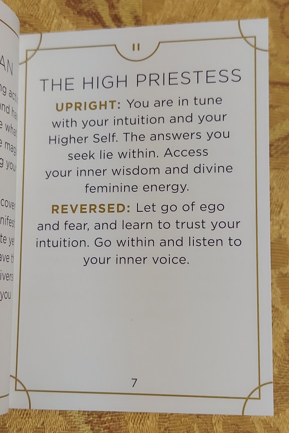 As for the LWB, I understand that so many of us rarely if ever read the LWB. I certainly have other, stronger resources on which to draw, but if I am going to bother to write down my thoughts about the entire package, I need to look at the entire package. Bridget Esselmont wrote the LWB for the Everyday Tarot, and I am pained to report that this little book is terribly unhelpful. Also, there is no mention of spreads or how to use the cards in the book itself. That information, embarrassingly sparse, is relegated to two extra cards included in the deck. With no disrespect intended, I could not discern a real stance or point of view in the LWB. As an exercise in verbiage, the author succeeds wonderfully, but as a useful tool for understanding the tarot, I recommend looking elsewhere. For each card, there are roughly six sentences of interpretation—three upright, three reversed—which are so close in meaning as to be almost repetitive. I understand that the upright interpretations are perhaps intended to be more oracular affirmations, while the reversed statements attempt more assertive claims to learning from adversity, but I can’t say that this approach—if, indeed, this was the approach—succeeds.