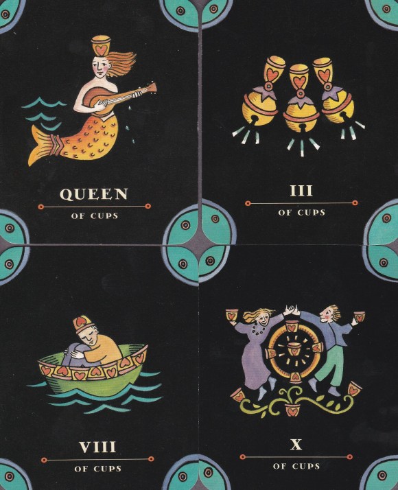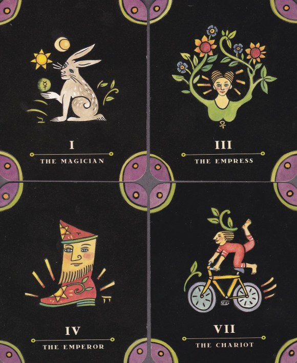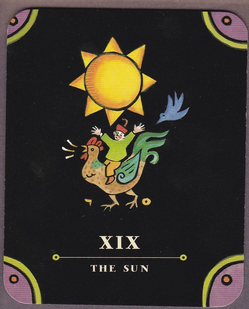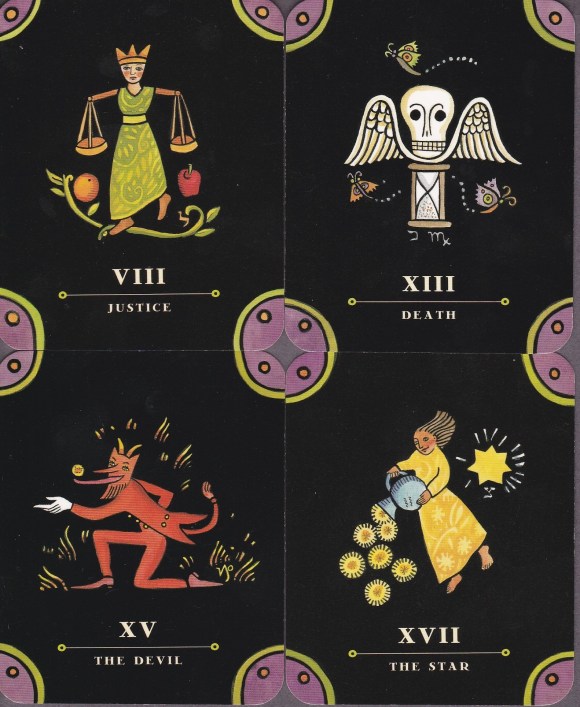 The cards themselves are exquisite. The Tarot Nova is one of the very few decks that I have purchased twice. The artwork by Julie Paschkis touches me in a primal way. The bright, clear images set against the warm black ground work exceedingly well artistically, and they have elicited some of the most interesting readings I have ever given. Her images belie her inspiration in the joyous folk art of Eastern Europe. The cards follow a bare-bones version of the Rider-Waite-Smith imagery, but even then, the simplicity and originality of the images plays with our eyes. The five suits are divided with color-coded corners which follow the Golden Dawn attributions on the minors (wands: red; cups: blue; swords: yellow; and coins: green) and a royal purple on the trumps. In a brilliant move by Paschkis, she opts to use traditional (though modified) playing card suit emblems throughout three suits of the minors. This lends an air of instant familiarity to the images that I absolutely adore. How she then arranges the emblems to form such creative and delightful scenes is a true testament to her ability. Furthermore, in images that are lively and colorful, yet pointed and direct, she has managed to get most of the Golden Dawn zodiacal, kabbalistic, and elemental attributes on her tiny trumps while still elaborating the cards with ornate flora and decorative fauna from the folk art of Poland, Russia, and Ukraine. The recalcitrant rats and anthropomorphic boots speak to me in a language that transcends their deceptively simple imagery.