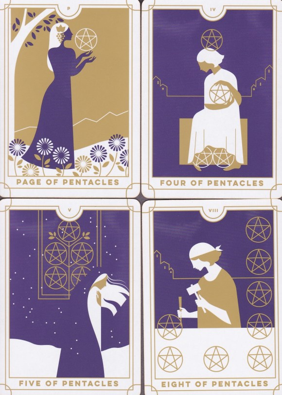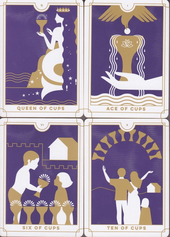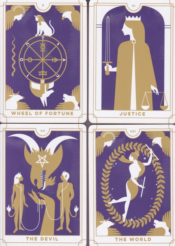 The images are minimalist without being sterile, and the predominant purple of the cards does have some variation in color that softens a potentially hard image. The colors are a perfect complement to each other. In fact, I live one state over from New Orleans, and I don’t mean to give Running Press any ideas, but Ms. Grosch could have thrown some green on those cards and rechristened the entire deck the Mardi Gras Tarot. The style, whose simplicity makes the International Icon Tarot look lush, works for most of the cards, but, given the limited color palette, when I look at the Fool and think of that card’s long history, I wonder if he has any pants on. On the other hand, the serenity of the clean imagery reinforces the meditative aspect of the Hanged Man, and there are wonderful nods to the RWS symbolism that resonate well within the images. The Empress, for example, wears Venusian earrings and the woman on Strength wears a headband in the shape of the lemniscate.
