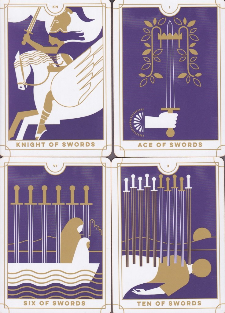 A quarter century later, RP Minis has produced the Everyday Tarot. (Please don’t confuse this with Poppy Palin’s Everyday Enchantment Tarot.) This little deck comes nicely packaged, reflecting the design genetics of the second version of the Tarot Nova, but in this publication, the box where the cards are housed is plastic and honestly rather odd feeling. The little white book (LWB) is nestled comfortably on the other side of the box. That aside, the box is a very accurate reflection of what one can expect on the inside: a stylized, predominantly purple tarot experience with strong accents of gold and white.