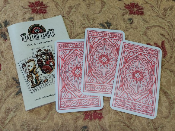 Dammit. They had me. I wanted to grab one of the overweight, over-pierced little whipper-shoppers and demand to tell her whether her boyfriend loved her or not, I wanted to take that greasy-haired, pimply-faced young man debating whether to major in philosophy or just to devote it all to the music and lay out those cards. Gods, the rush, man. After a minute to collect myself and my boy, I am glad to report that while so much of the store was appealing, my son and I left with not one item decorated with either a four-letter word or a marijuana leaf. I did, however, leave with the Tattoo Tarot: Ink and Intuition.