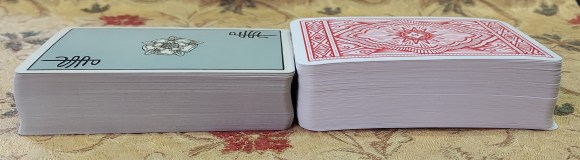 Are there any drawbacks? Is this the perfect deck? Well, no. Besides the fact that the perfect deck is a myth, I do feel the need to mention the fact that these cards are almost impossible to shuffle. I have already admitted my fondness for their tactile nature, but unfortunately, the cards do not glide over each other at all, and the cardboard of the cards themselves makes riffling difficult to say the least. The cards are thick, unyielding, and unwieldy. The last time I tried to use them, my inability to comfortably shuffle the cards in any way made me give up and grab another deck in frustration. While I am sure that with enough use, they will begin to become more usable, they do not come out of the box that way. Otherwise, however, they are a delight, and I am glad to add them to my collection.
