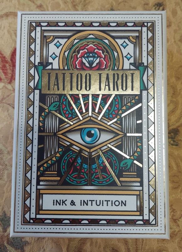 While the Tattoo Tarot: Ink and Intuition may not be the first tarot deck based upon tattoo imagery, I find it more artistically present, tattoo-forward, and coherent than other tattoo-based decks I’ve seen. The U.K.-based artist Megamunden has taken the cards in a wonderful direction; the bold, straightforward images pay homage to both tattoo flash imagery and the Tarot de Marseille (TdM). The packaging, a sturdy two-part box decorated with subtler tattoo icons surrounded by clean mid-fifties Art Deco lines and gold foil accents, is eye-catching even among a host of other eye-catching things.