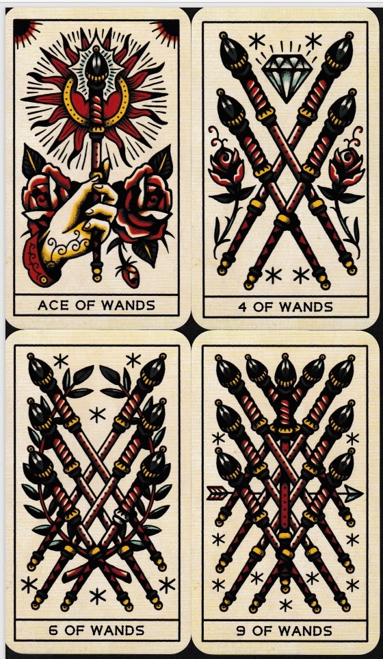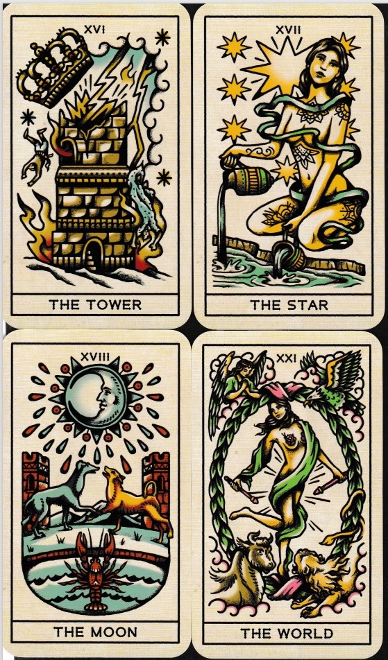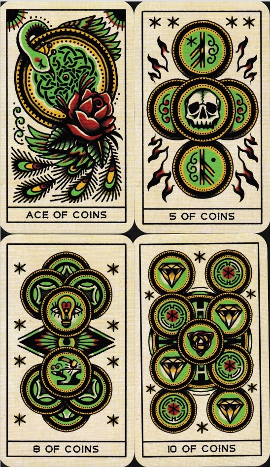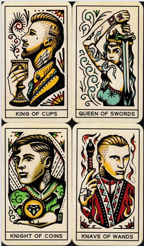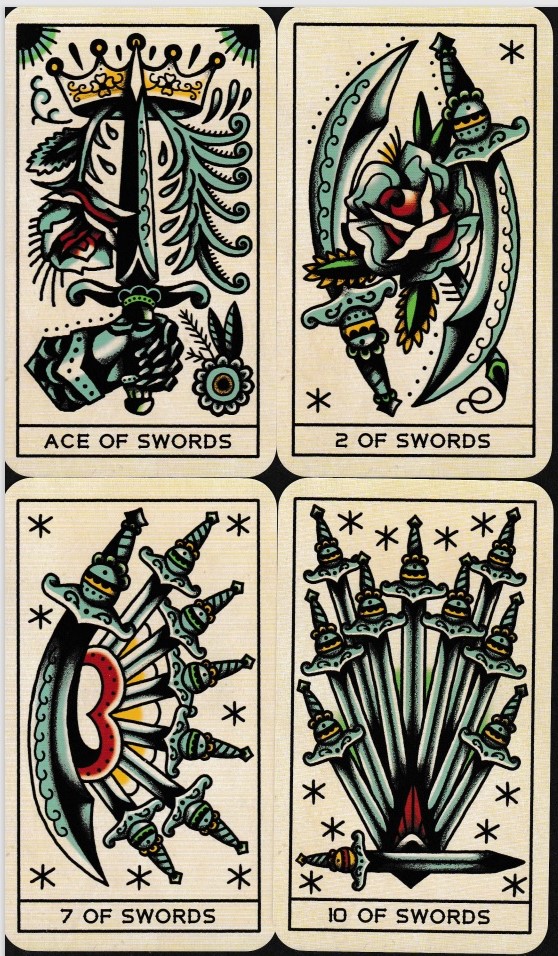 The LWB is a larger format guide written by Diana McMahon Collis, and in the introduction, she posits what I immediately noted as this deck’s strength: “In decks keen to preserve simplicity, alongside beauty, the clean lines of the traditional Marseille patterns feature across all the cards—as with Tattoo Tarot.” Additionally, she offers a brief look at the growth of skin art’s widening social acceptance. McMahon Collis also speaks to “conducting a reading” and “drawing and interpreting the cards,” and in these sections, one finds a nice give and take between the new practitioner’s needs to both use a resource for meanings while at the same time seeking more intuitive interpretations based on a more meditative, observant approach to the images.
