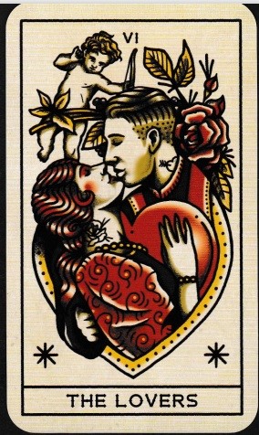 The linework and coloration of the deck are exquisite. On the back, the artist gives us beautiful, reversible red linework reminiscent of traditional playing cards. On the front, the palette of the deck consists of six colors, black lines, and white spaces. The limited color scheme and strong lines give the deck a beautiful, unified look. The colors themselves are lush and dark, warm and inviting. While I understand that they may be a bit dark for some, the artistry is evident and the tattoo theme on full display. The classic tattoo style also lends the cards a kind of paradoxically antiquated feel. The Lovers, in particular, strays from the more traditional imagery (and I am glad of this) to become the grand, fairy tale love between a flapper and the dapper. With little alteration, my grandfather may have come back from WWII Europe with this image on his person. (He chose instead a similarly themed naked lady on one arm and an enormous military eagle across his chest.)