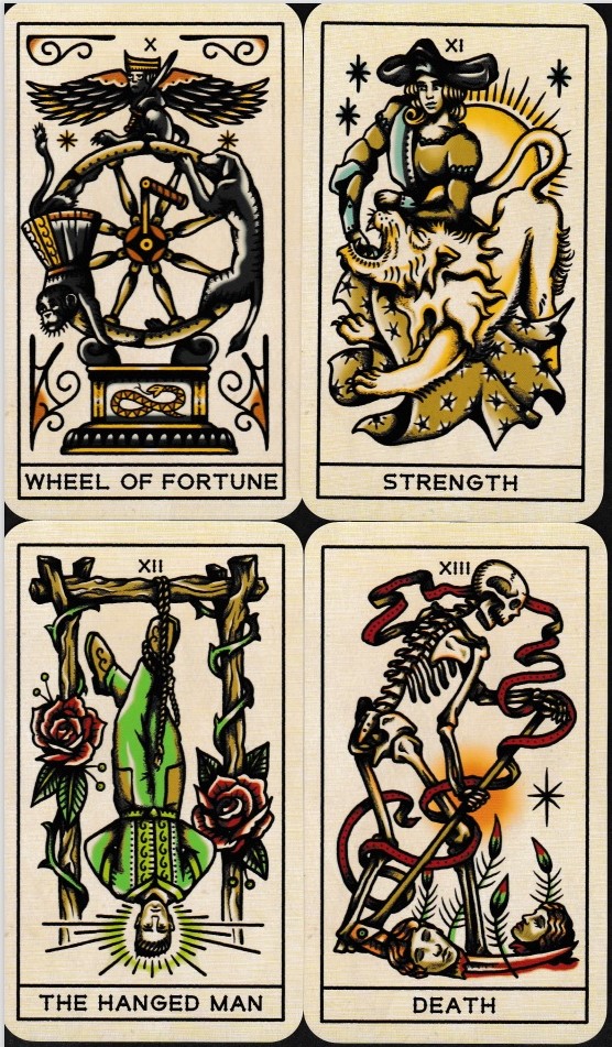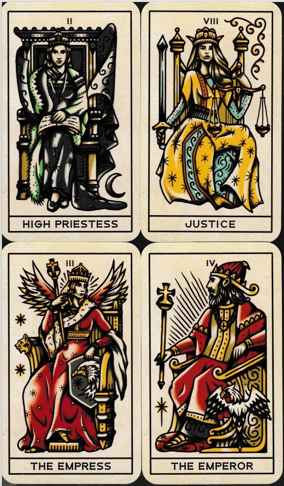 In addition to the feel of the cards, they are beautiful. The images are the kismet blending of two imagistic systems that I never knew could work so well: the Tarot de Marseille (TdM) and the traditional tattoo style of the early-to-mid-twentieth-century. The style of the tattoos is clean and strong and in vogue once more in the early twenty-first century. Megamunden, with whom I am admittedly unfamiliar, has bridged that artistic gap in a magnificent fashion, and I am sure that the not-insignificant overlap of tarot and tattoo enthusiasts are placing these images on their bodies. The trumps are a visual accomplishment, at once staying very true to their Marseille origins while at the same time giving the Reader something new: the more pensive look of the Fool, the roses on the Hanged Man, the tatted Star.