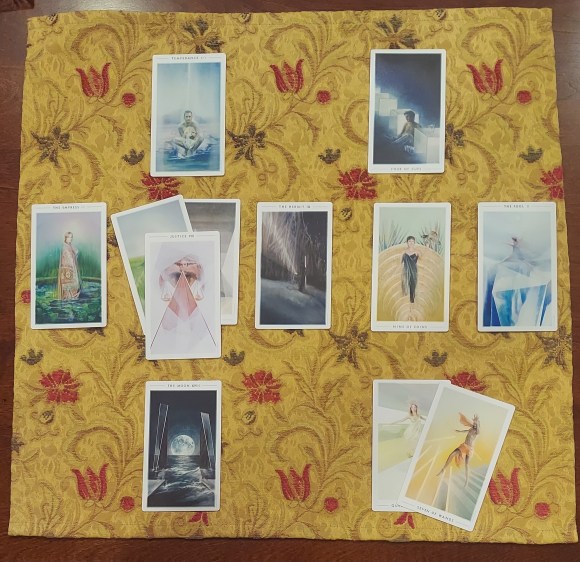Around the table sat both young women, the boyfriend, another dear female friend, and my daughter. A communal vote decided that M— would have her reading first since she knew what to expect and this would give R— a chance to watch a reading or two before having her own. I performed two readings for M—: a Celtic Cross and a Five-Card Yes-No Variant. While I didn’t realize it at the time, I appear to have broached enough subjects in the two readings for M— that R— was now more nervous, not less.