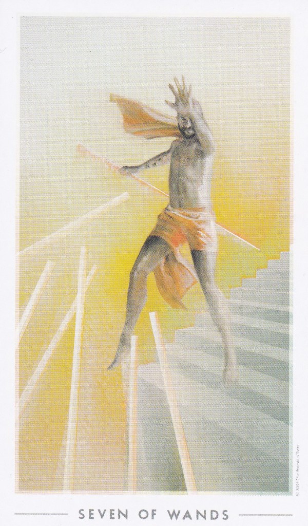 I then noticed the four cards together. Very often, one can see definite trends in the cards laid down in a spread. For her, the Temperance card above her, the Hermit to her side, the Seven of Wands, and the Four of Cups all suggested the opposite of the Empress, a pulling away, a separation, a mitigation of the potential extravagances of the joyful Queen of Queens. I talked about how she sought balance. We talked for a moment about what “temperance” actually means, and I am always a bit surprised. Perhaps I never noticed before, but it seems to me that the idea of “temperance,” of restraint against excess, against thoughtless polarization, has become foreign to people; the “middle path,” whether socially, personally, or politically, is an intellectual terra incognita.