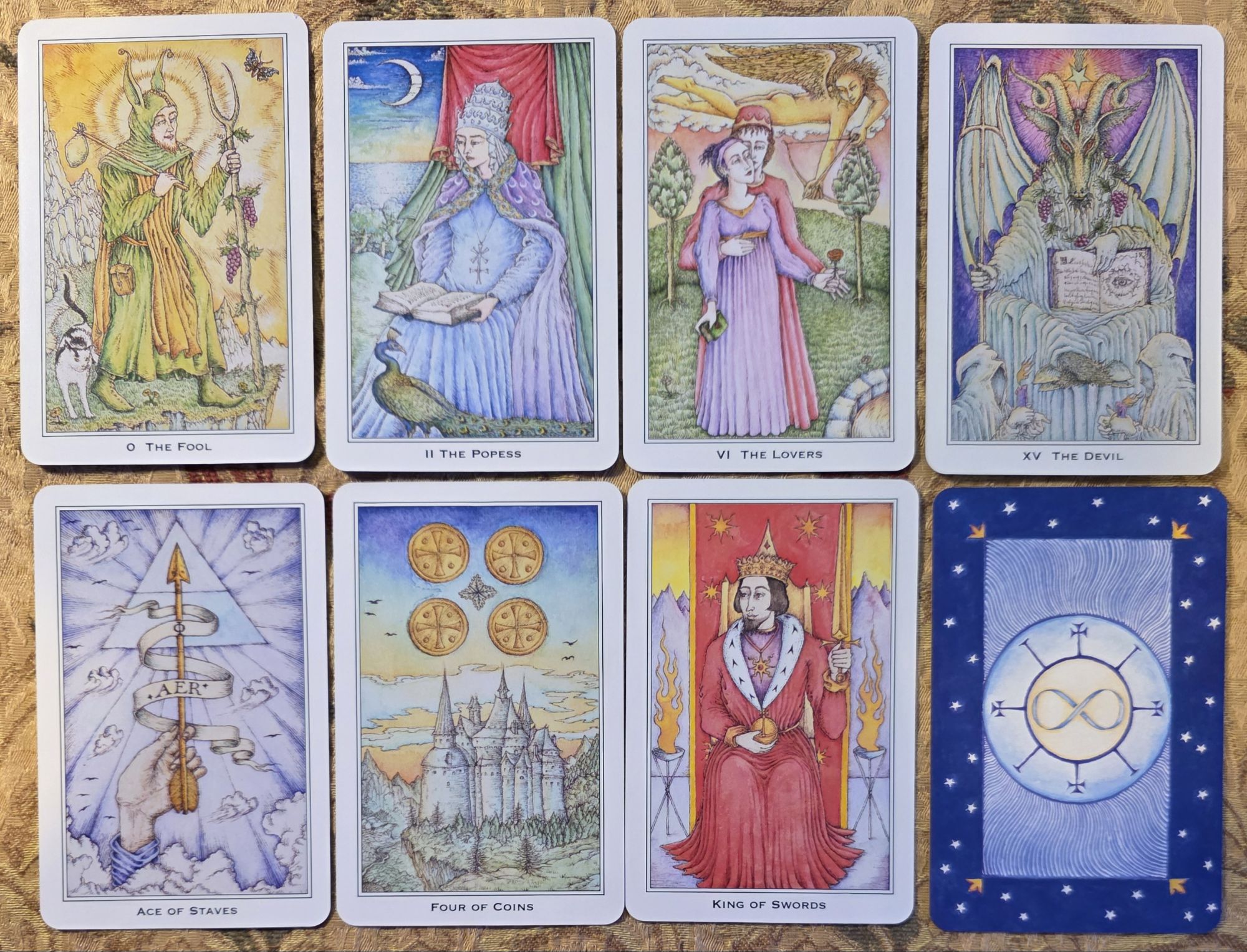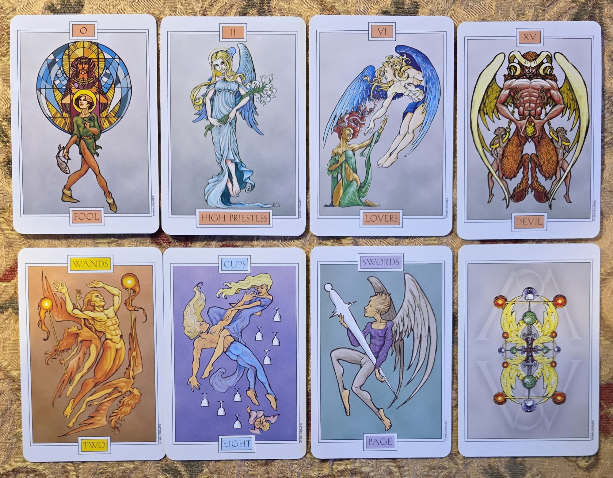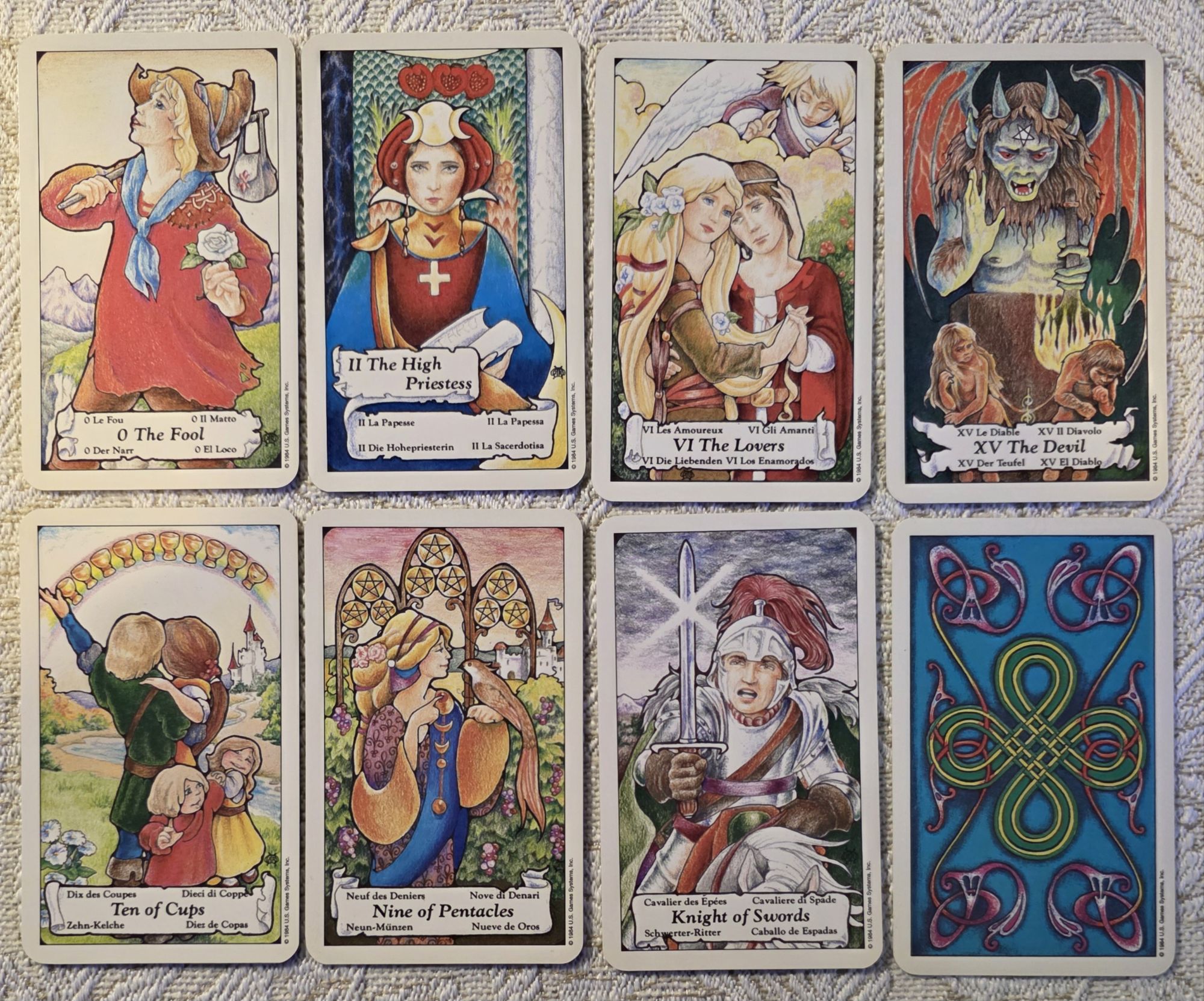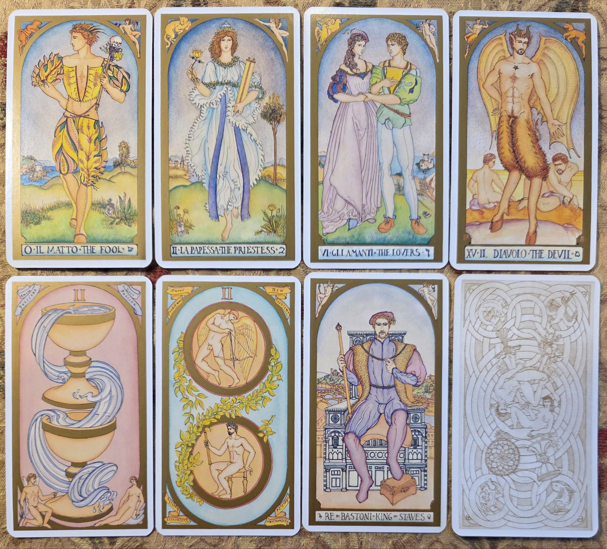 The decks listed below are decks that are in my personal collection. I have listed them alphabetically to the best of my ability, eliminating initial articles such as “a,” “the,” “le,” “il,” etc. The name of the deck will have a link to a selection of cards from that deck. If I know the deck is out-of-print (OOP), I will indicate that. After the name, you will see the publisher and the type of deck that it is in a broad sense: