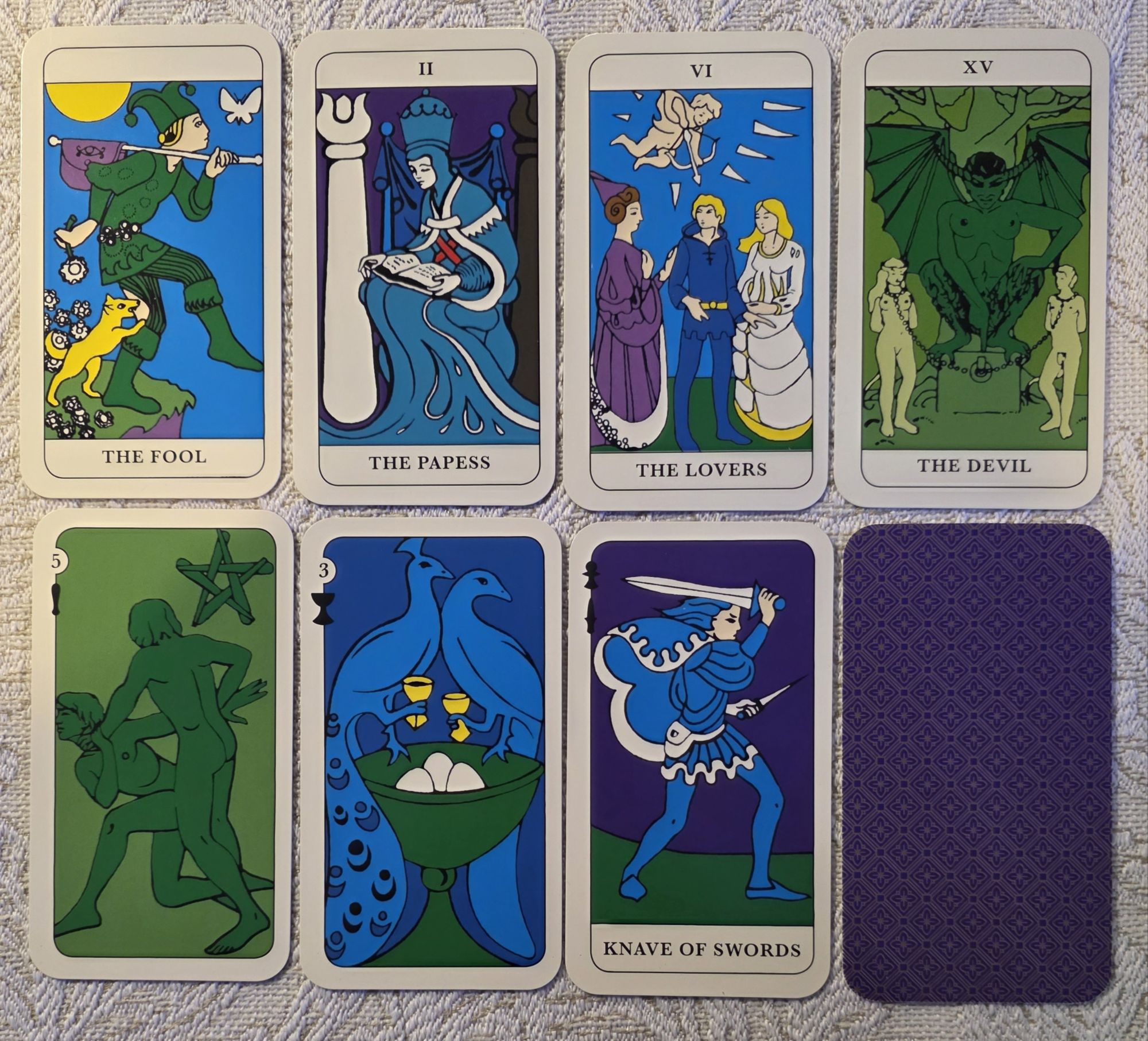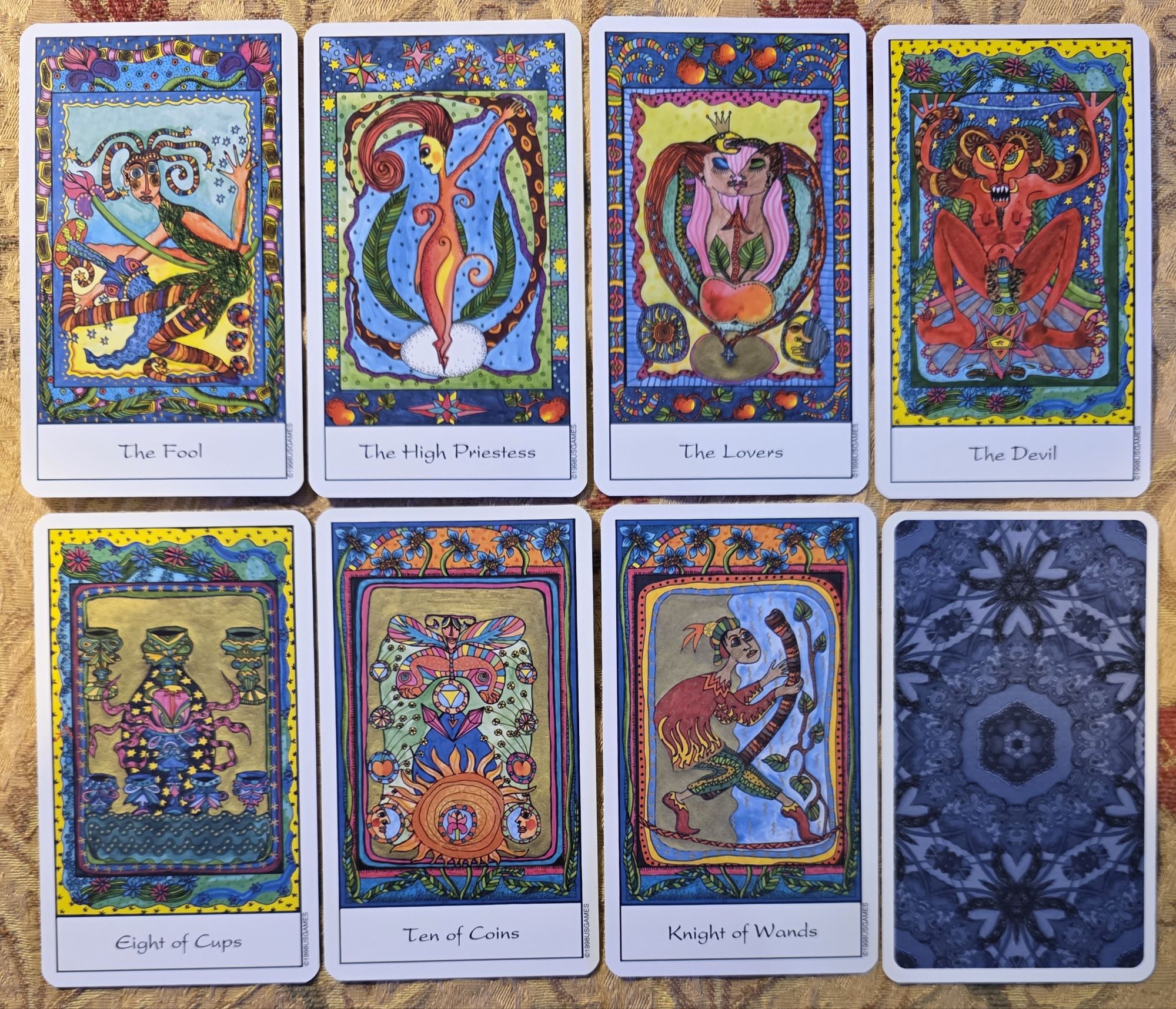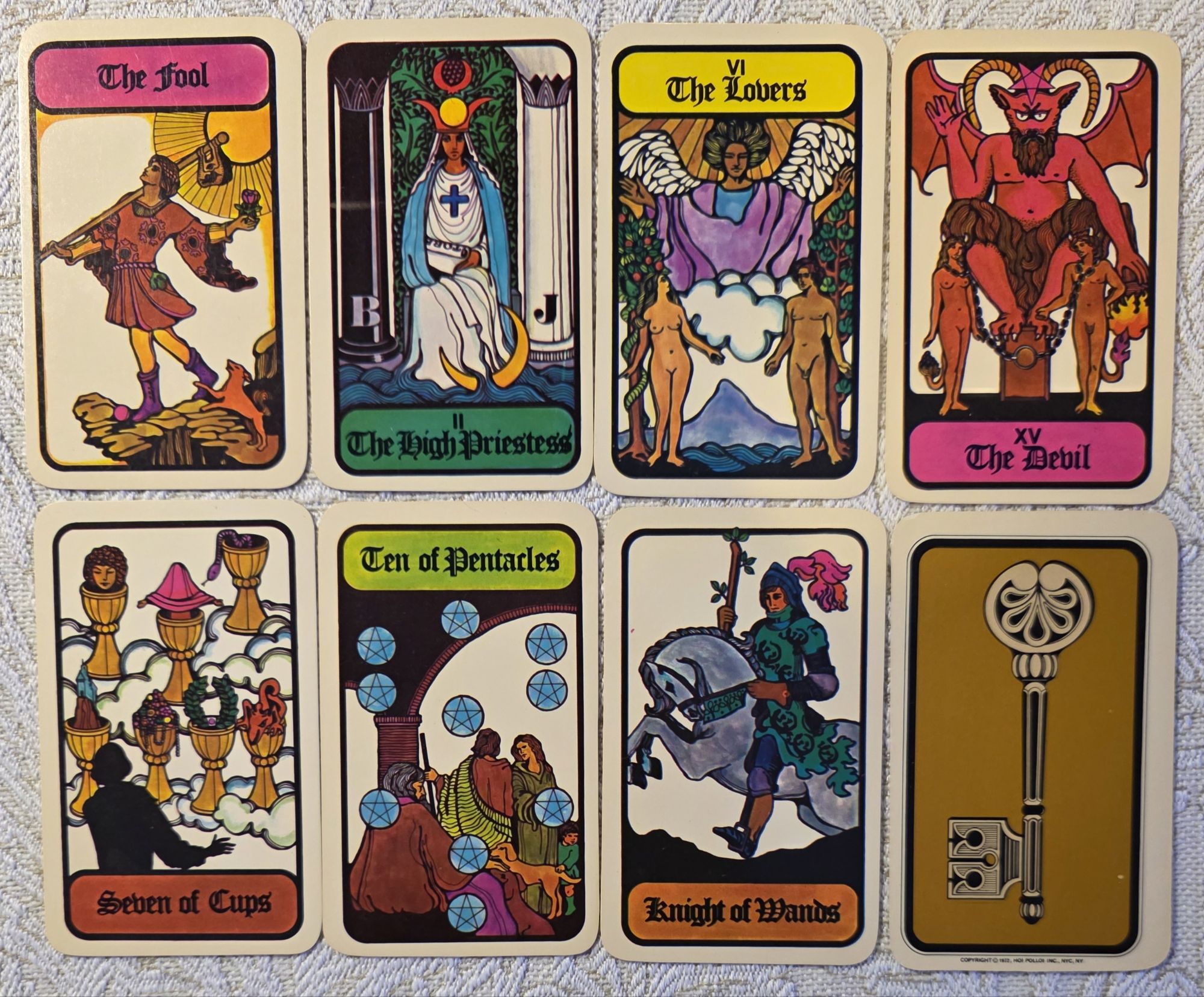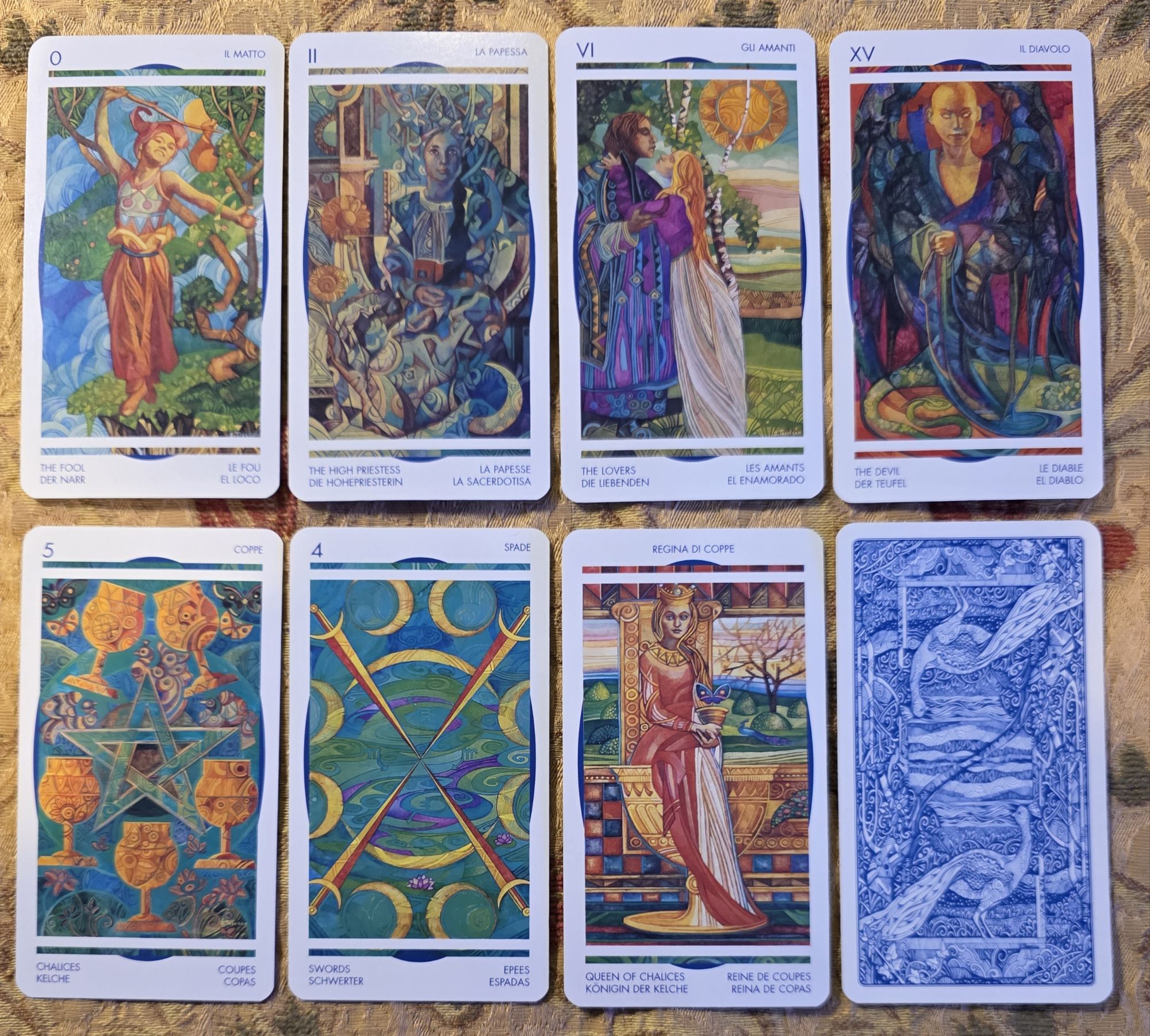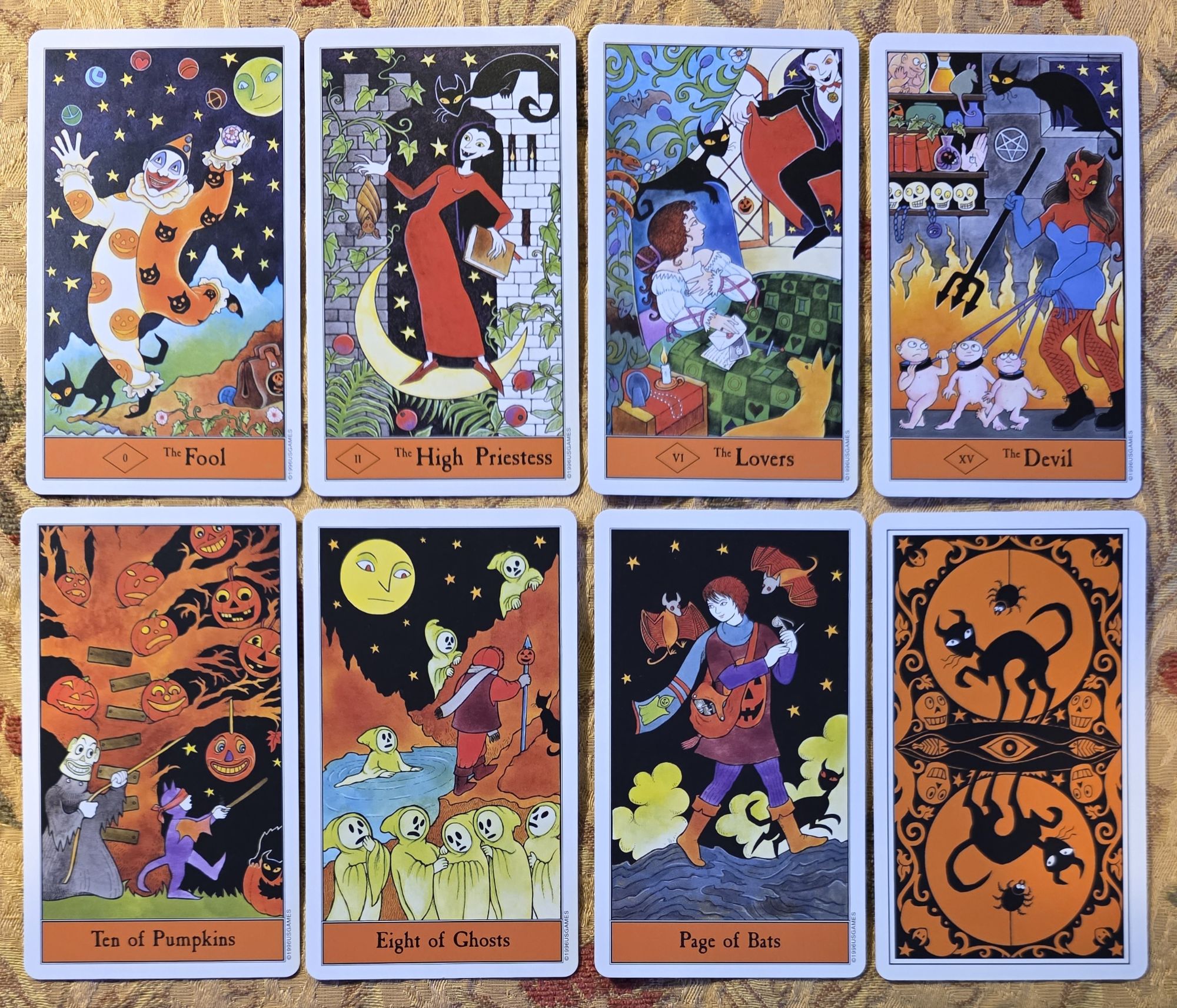 The decks listed below are decks that are in my personal collection. I have listed them alphabetically to the best of my ability, eliminating initial articles such as “a,” “the,” “le,” “il,” etc. The name of the deck will have a link to a selection of cards from that deck. If I know the deck is out-of-print (OOP), I will indicate that. After the name, you will see the publisher and the type of deck that it is in a broad sense: