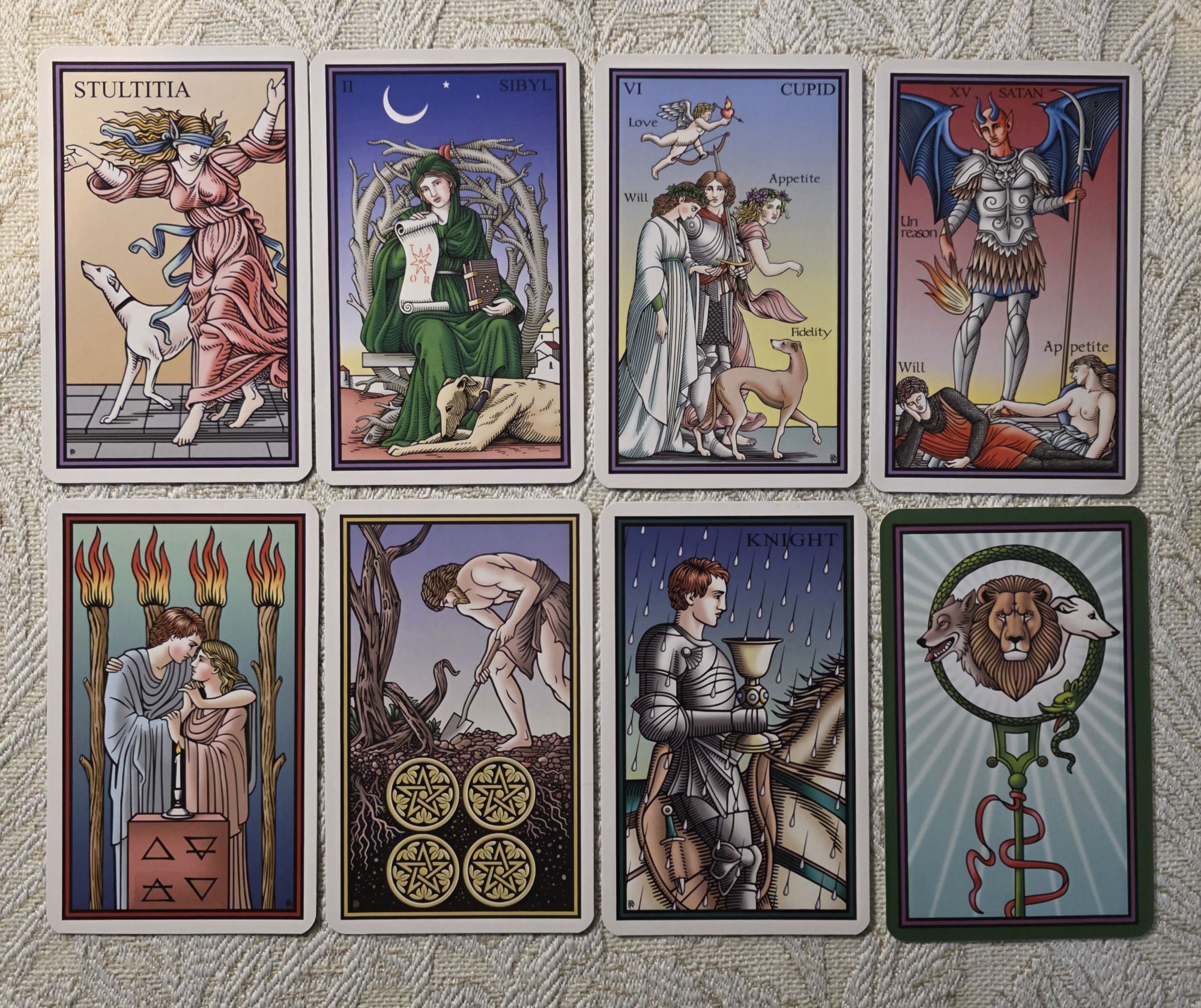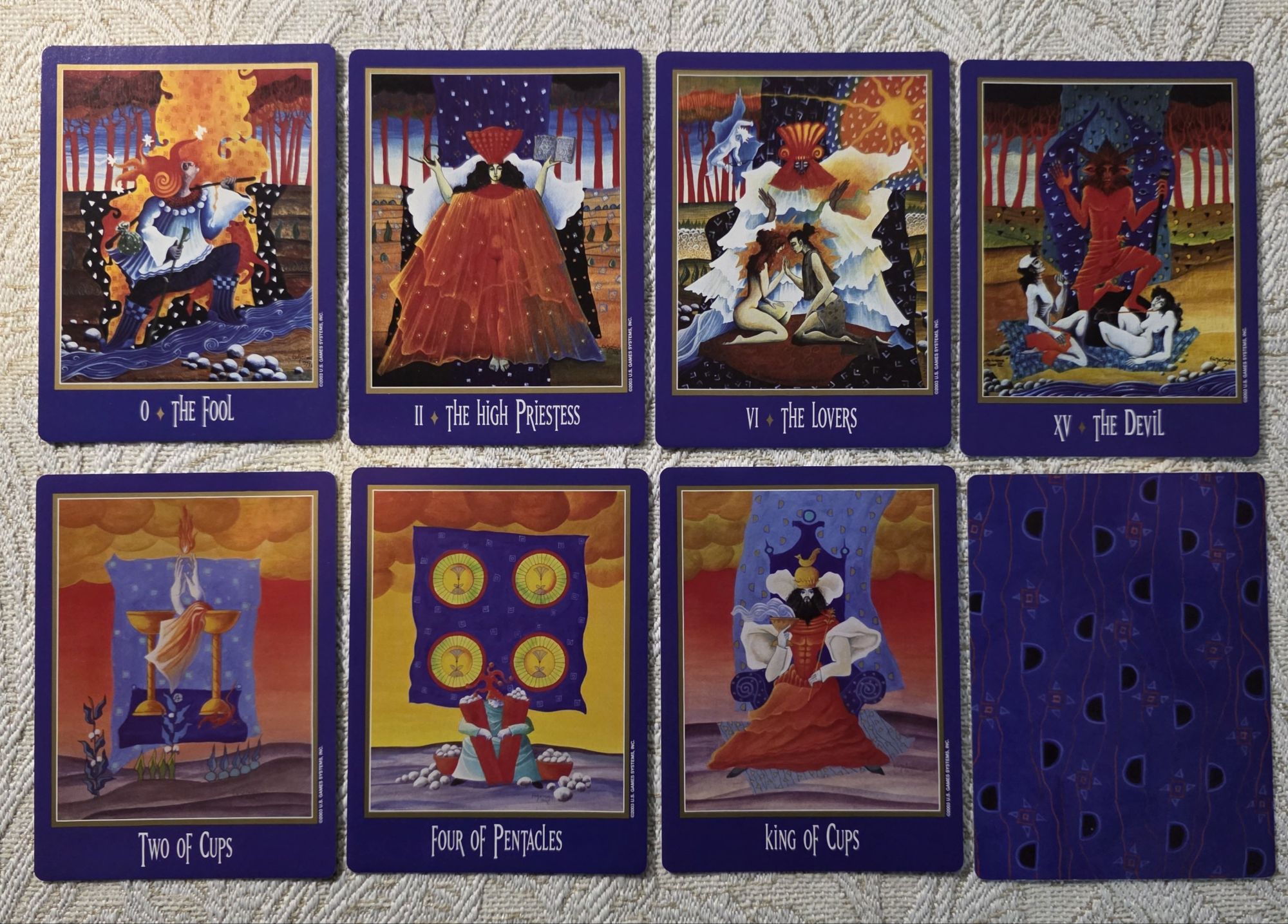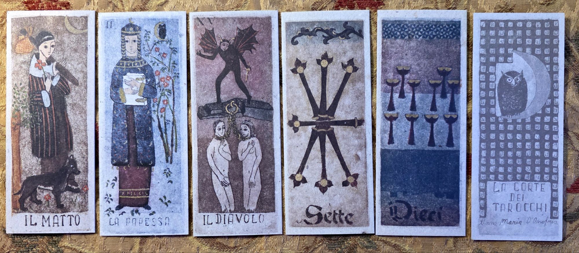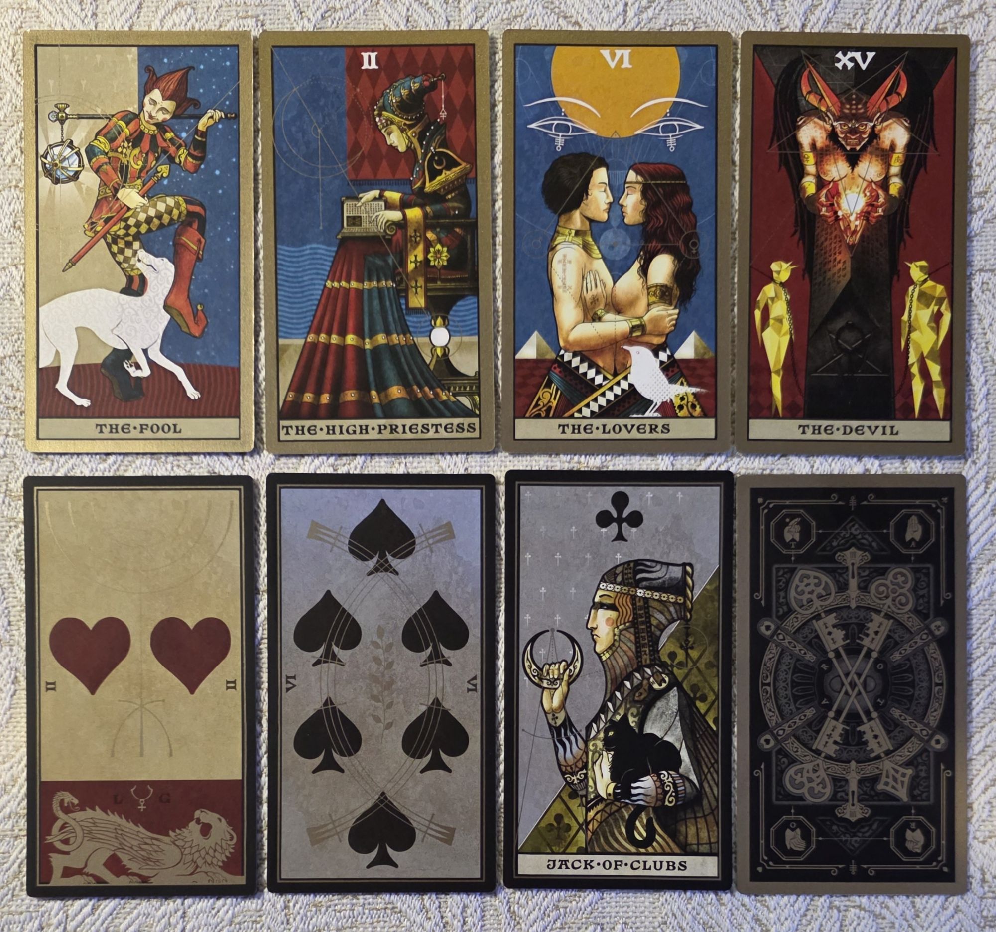 The decks listed below are decks that are in my personal collection. I have listed them alphabetically to the best of my ability, eliminating initial articles such as “a,” “the,” “le,” “il,” etc. The name of the deck will have a link to a selection of cards from that deck. If I know the deck is out-of-print (OOP), I will indicate that. After the name, you will see the publisher and the type of deck that it is in a broad sense: